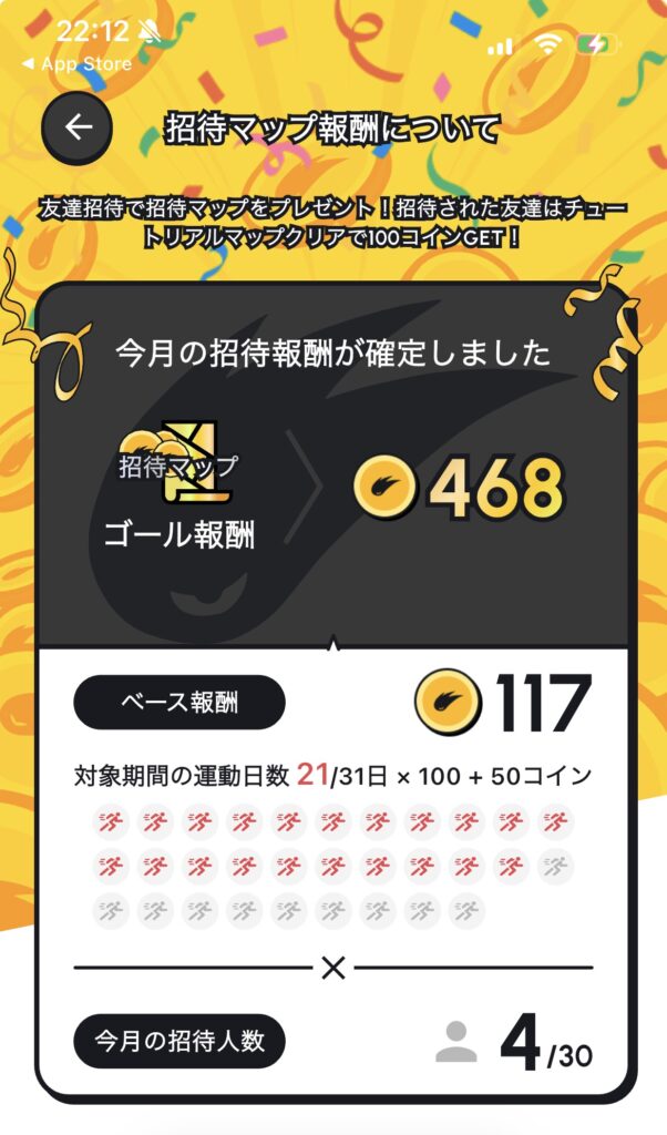 つまり「前月にちゃんと歩いて、友達も何人か招待しておくと、1回のマップで数千コインも夢じゃない」という爆発力を持ったイベントなんですよ。