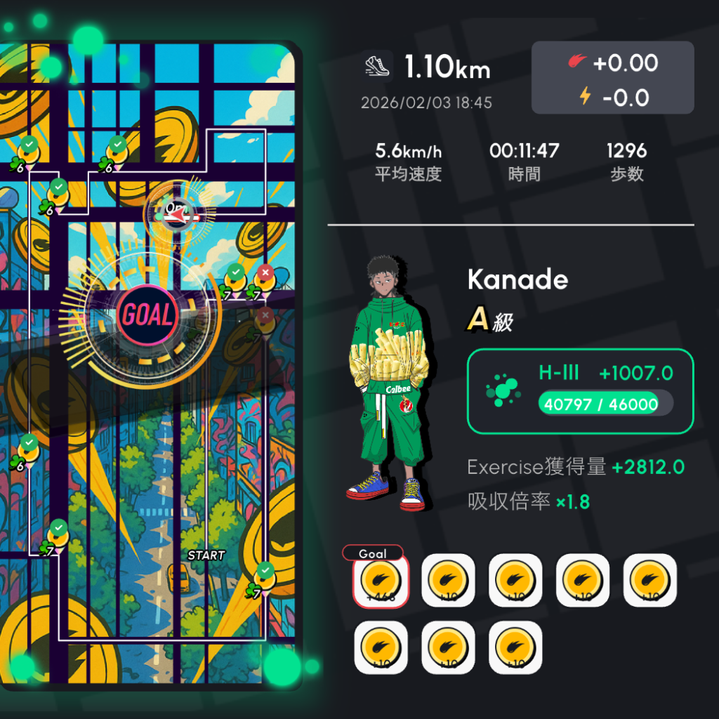 ・ベース報酬 = (前月の運動日数 ÷ 前月の総日数) × 50 + 50コイン (最大100コイン)