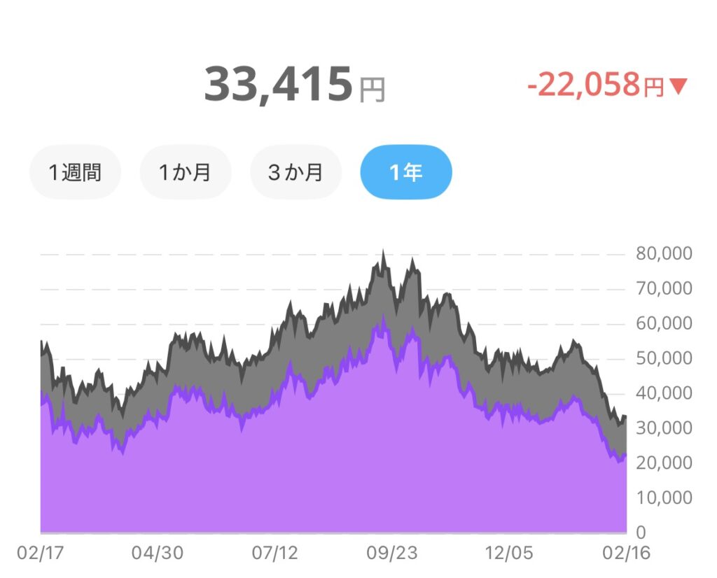 ここからは暗号資産の口座です。1年単位で見ると80000円近くまで上がったのが今は33000円と半分以下となっています。