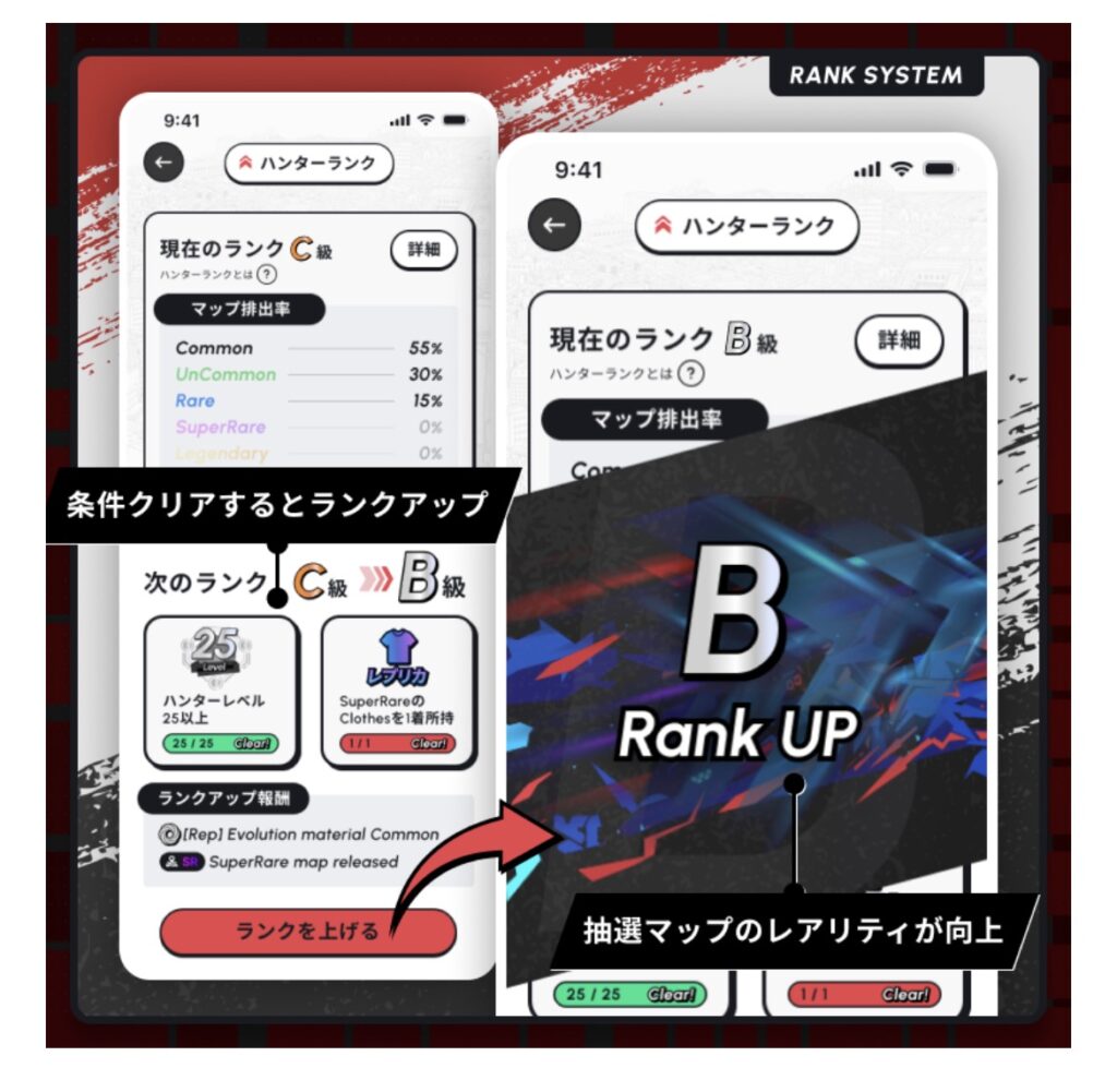 - ハンターランクシステム:初心者はF級からスタート。歩くほど経験値が溜まり、E級、D級…とランクアップ。高いランクになるとマップのレア度影響が出てきたり、有利に進めていけます。